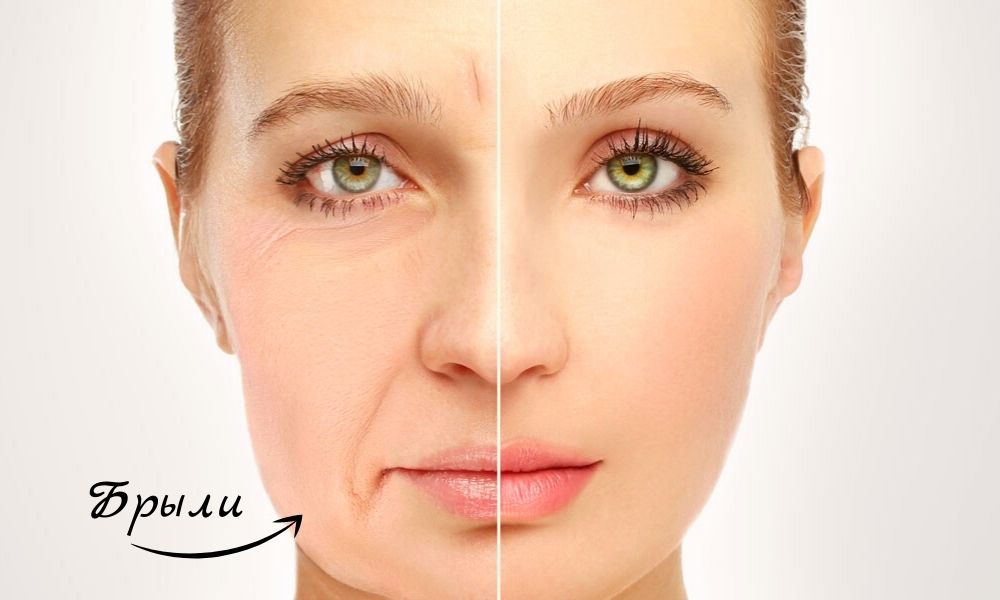 Брыли — это опущение кожи и жировой клетчатки на участках нижней трети лица (щеки, подбородок) в результате снижения тургора кожи из-за уменьшения выработки коллагена и эластина. Как итог, контур лица становится менее четким, носогубные складки заметнее, а лицо приобретает усталый вид. Средний возраст появление брылей 30-35 лет.